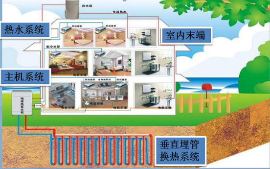 土壤源熱泵以大地作為熱源和冷源,通過(guò)把熱泵的換熱器埋于地下,與大地進(jìn)行冷熱交換。冬季從大地中吸收熱量,是循環(huán)水溫度升高,供給地源熱泵機(jī)組,然后經(jīng)過(guò)熱泵機(jī)組向建筑物供熱。夏季循環(huán)水通過(guò)地埋管將熱量排放到大地中,使水溫度降低的循環(huán)水供給熱泵機(jī)組,然后向建筑物制冷。